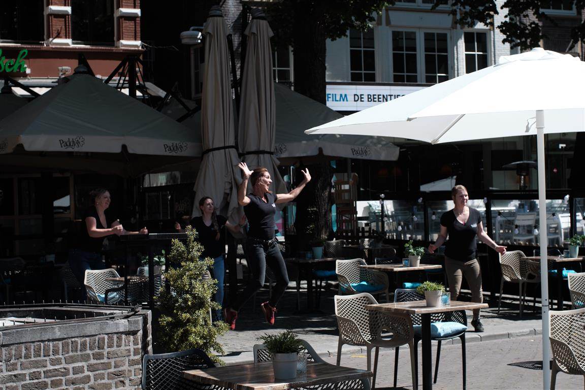 Alle terrassen zijn een stuk de Oude Markt opgeschoven. Of, waar dat niet kan, zijwaarts uitgebreid. Na wat rondvragen schatten we dat de capaciteit ruwweg de helft is van normaal. Maar dat lijkt de pret niet te drukken. De meeste cafés hebben flink wat personeel opgeroepen - deels anticiperend op drukte, maar ook omdat de heropening een feestje is dat ze graag gezamenlijk vieren.