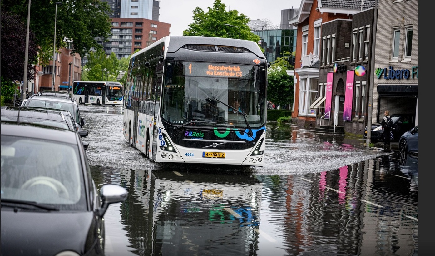 Enschede is al een mooi eind op weg om de gevolgen van de klimaatverandering het hoofd te bieden. Overal liggen waterkelders om overvloedig regenwater even vast te houden, er zijn wadi’s aangelegd zodat het vocht in de grond kan infiltreren, de Stadsbeek zorgt voor vermindering van de overlast in de wijken waar de beek doorheen loopt en in de Oldenzaalsestraat is een uitermate vernuftig waterbergingssysteem gelegd.