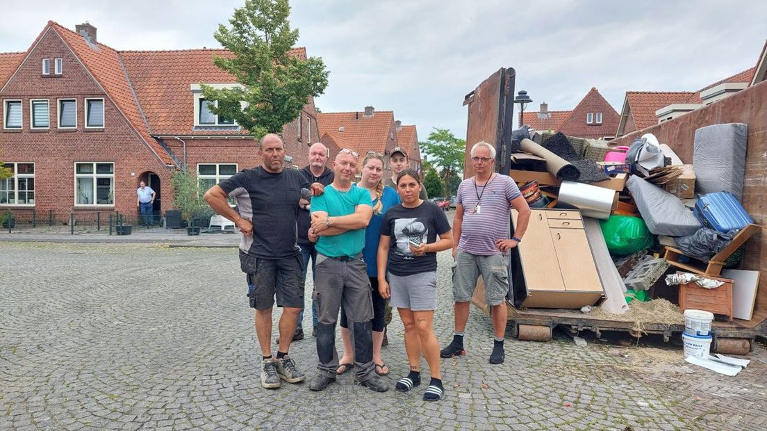 Bewoners van de wijk Pathmos naast een container met beschadigde inboedel uit hun woningen