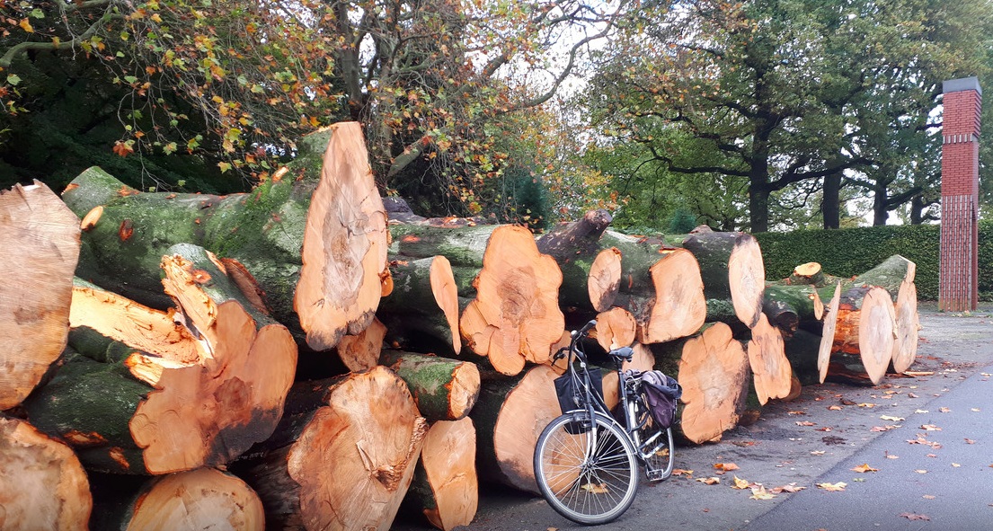 In het G.J. van Heekpark is begonnen met grootschalig bomenonderhoud. Het eerste resultaat ligt opgestapeld voor de ingang aan de Boddenkampsingel: boomstammen met een doorsnee van dik een meter.