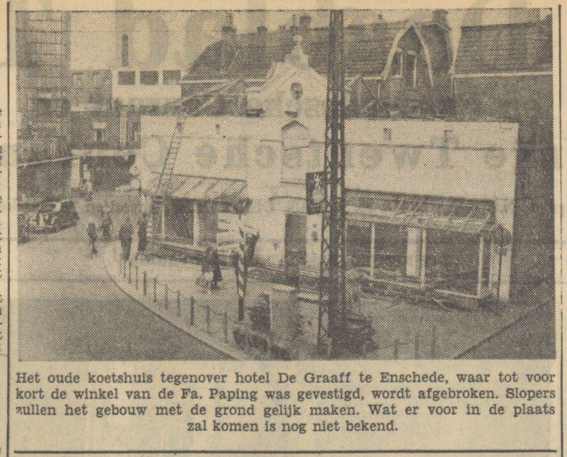 Kruispunt De Graaff sloop oud koetshuis later winkel Paping. krantenfoto Tubantia 10-7-1951
