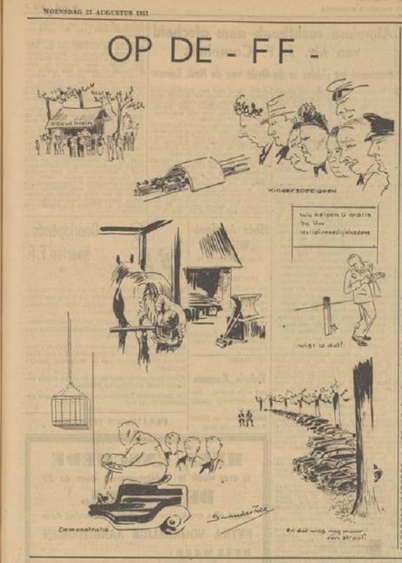 Een tekening van S. van der Zee in de Tubantia van 22-8-1951 van de FF tentoonstelling op het Volkspark.