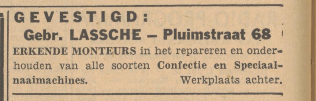 Pluimstraat 68 Gebr. Lassche reparatiebedrijf confectie- en speciaalnaaimachines advertentie Tubantia 1-2-1949 en 18-2-1950