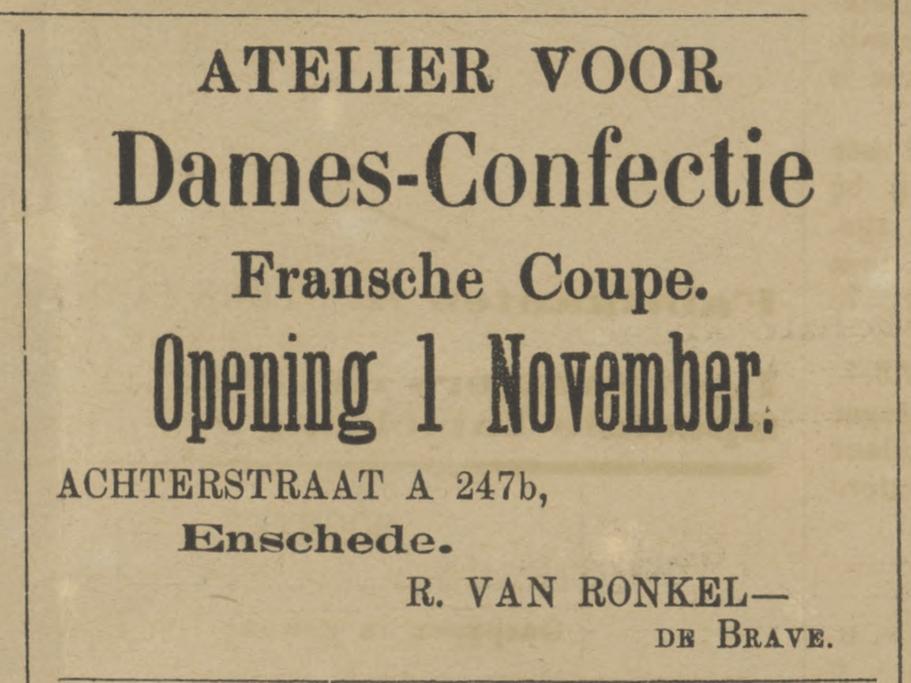 Achterstraat A 247b Atelier voor damesconfectie R. van Ronkel-de Brave advertentie Tubantia 18-10-1893.