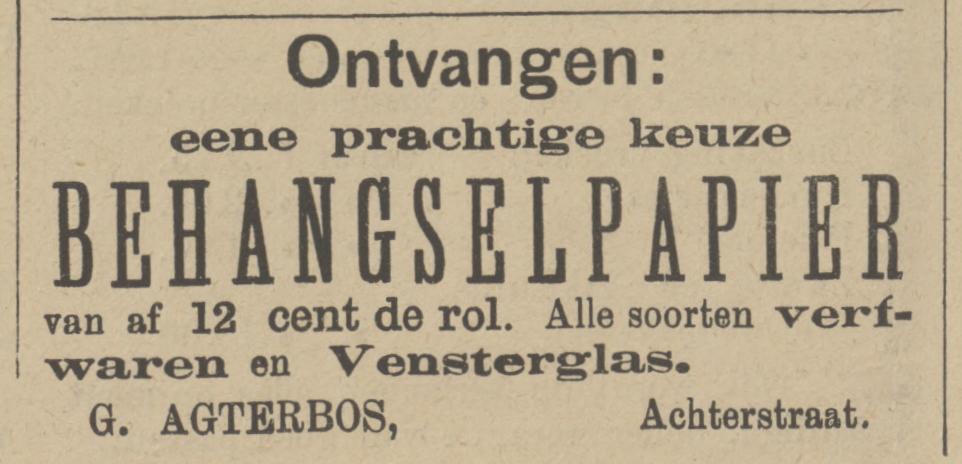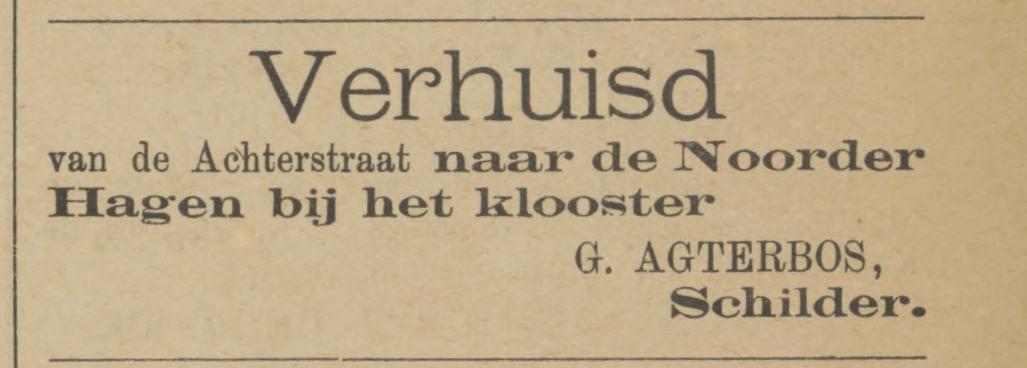 G. Agterbos mr. schilder aan de Achterstraat (Bij raadsbesluit van 23 november 1905 gewijzigd in Stadsgravenstraat) later verhuisd naar de Noorderhagen.