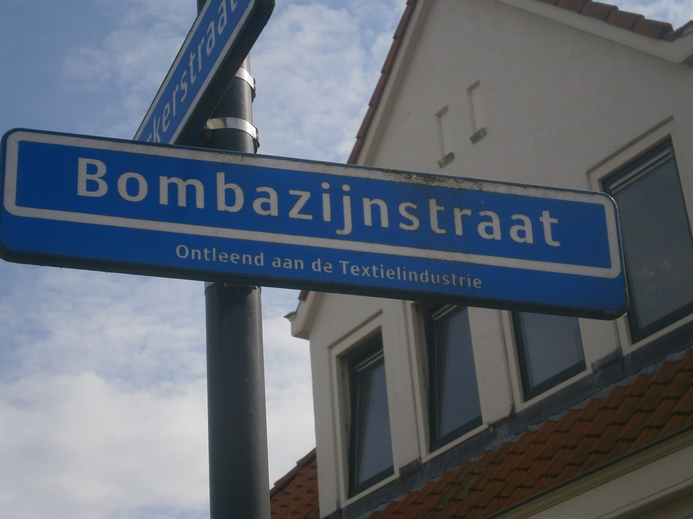 Naam ontleend aan de textielindustrie, waarin met "Bombazijn" een weefsel wordt aangeduid in kruiskeperbinding met grijs linnen ketting en ongetwijnd katoenen inslag (29 april 1915 voormalig Enschede). bron: http://straatnamen.enschede.nl/straten/00108/?char=B