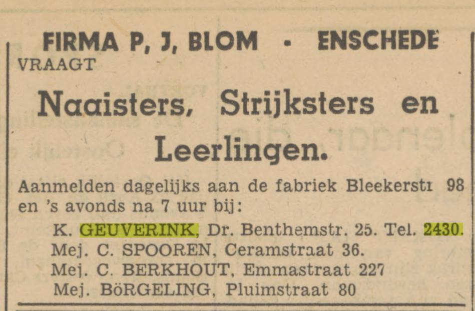 In 1947 woonde K. Geuverink nog aan de Dr. Benthemstraat 25 met hetzelfde tel.nr. 2430.