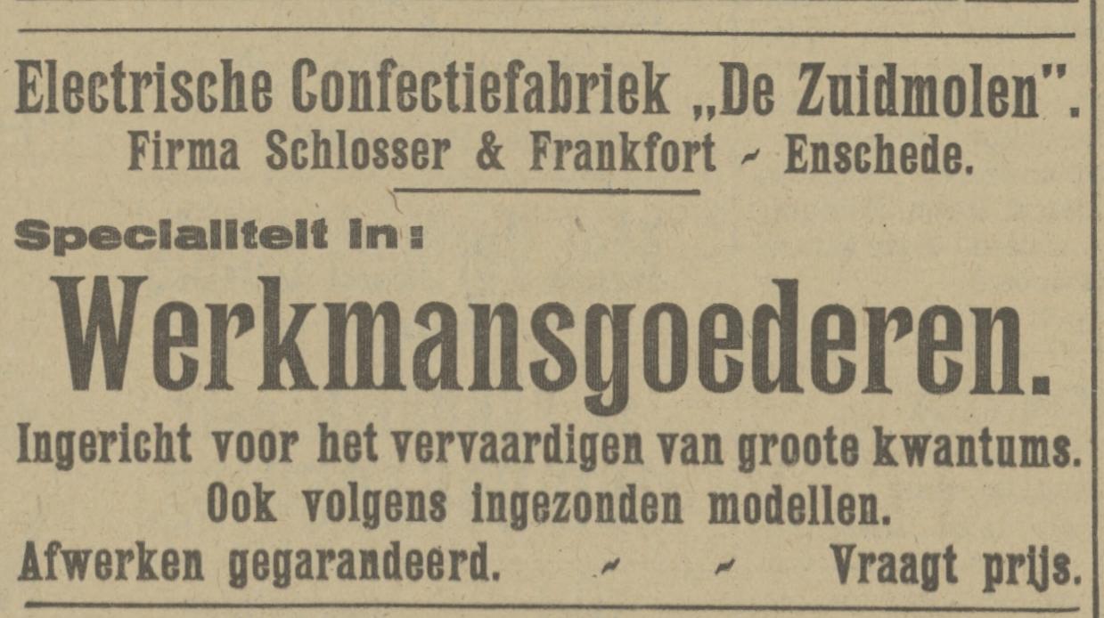 Electrische Confectiefabriek De Zuidmolen Firma Schlosser & Frankfort. advertentie Tubantia 16-6-1921