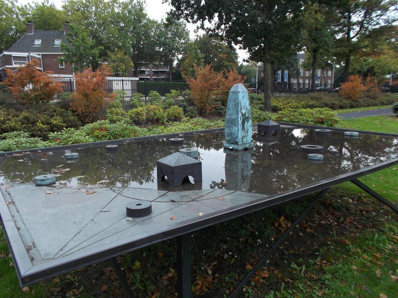 Ik zie dit kunstobject (of wat het ook is) al jarenlang in het G.J. van Heekpark staan. Vroeger stond dit bij de ingang vanaf de Boddenkampsingel. Ik vraagt mij af wat deze tafel met voorwerpen moet betekenen. Op de tafel staan ook cirkels met lijnen afgebeeld. Heeft het iets met geometrie of meetkunde te maken?