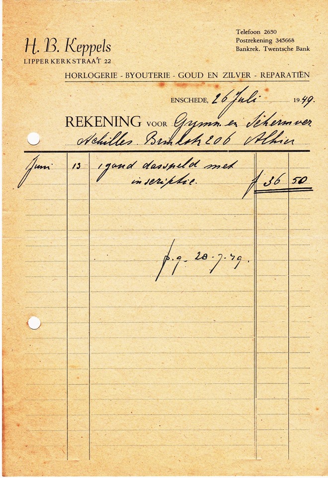 Lipperkerkstraat 22 juwelier H.B. Keppels rekening 26-7-1949