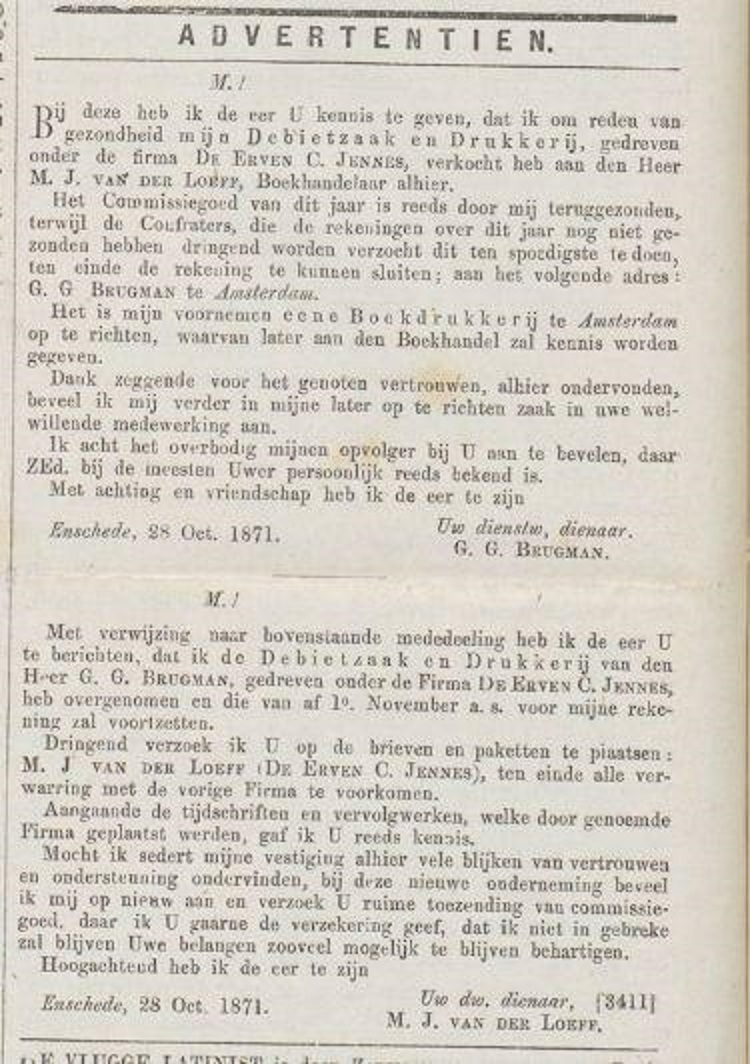 De Firma Erven C. Jennes was een drukkerij en boekhandelaar in Enschede welke later is overgedragen aan de Firma M.J. van der Loeff volgens onderstaande advertentie van 3-11-1871 in het Nieuwsblad voor den boekhandelaar.