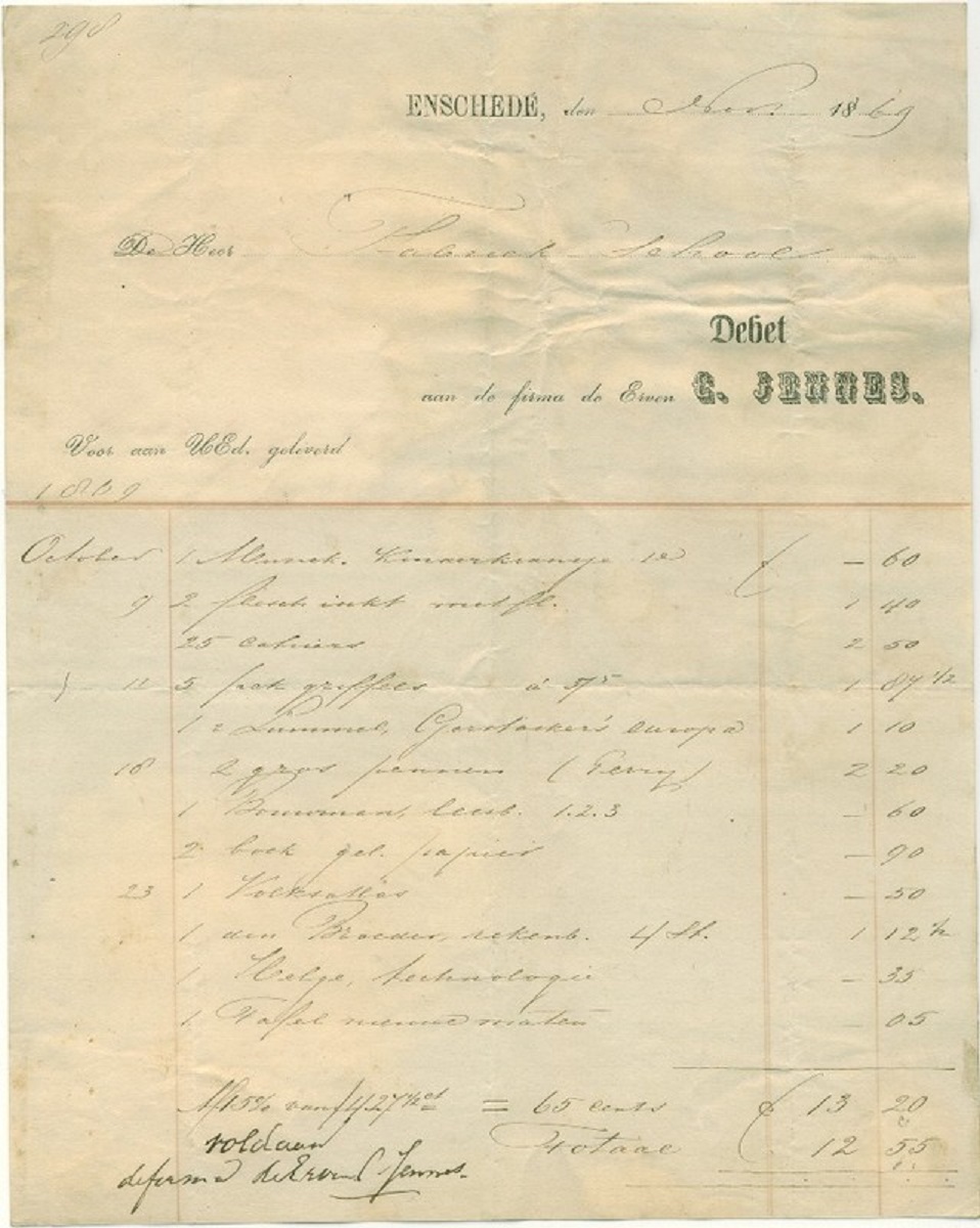 Erven C. Jennes boekhandelaar rekening 1869.