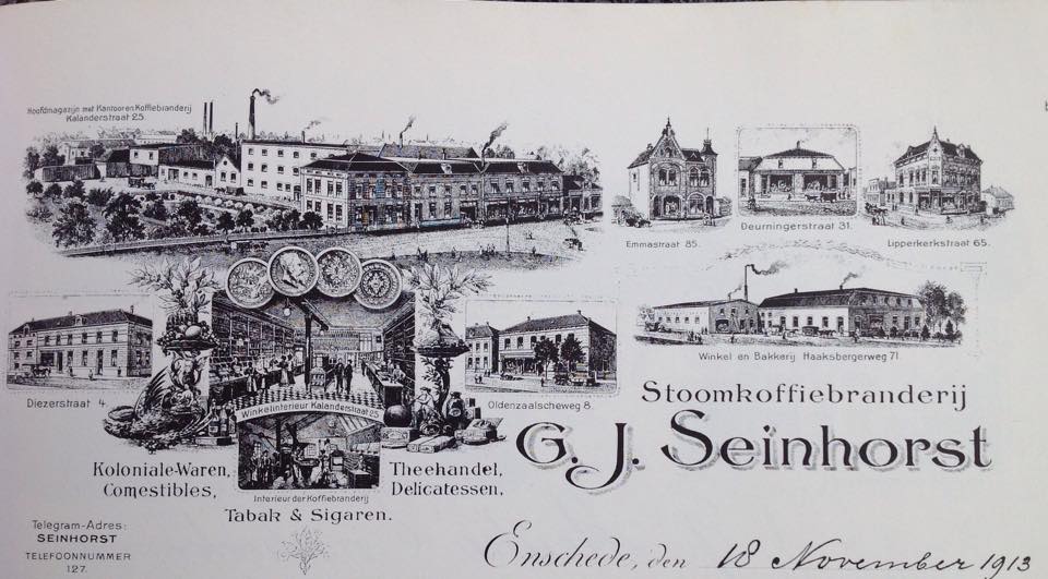Briefhoofden van Stoomkoffiebranderij G.J. Seinhorst aan de Kalanderstraat 25. Met vestigingenn aan de Emmastraat 85, Deurningerstraat 31, Lipperkerkstraat 65, Oldenzaalseweg 8, Diezerstraat 4. Winkel en bakkerij aan de Haaksbergerweg 71.