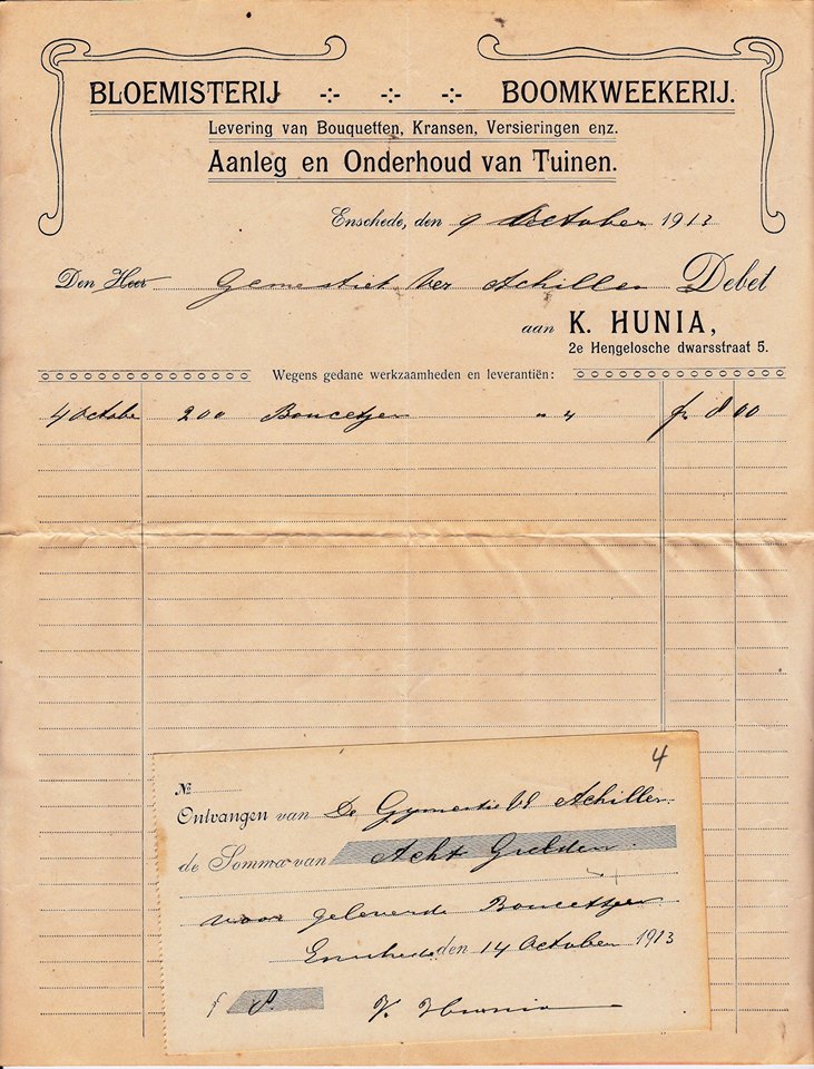 2e Hengelosche dwarsstraat 5 Bloemisterij Boomkweekerij K. Hunia nota 9-10-1913.
