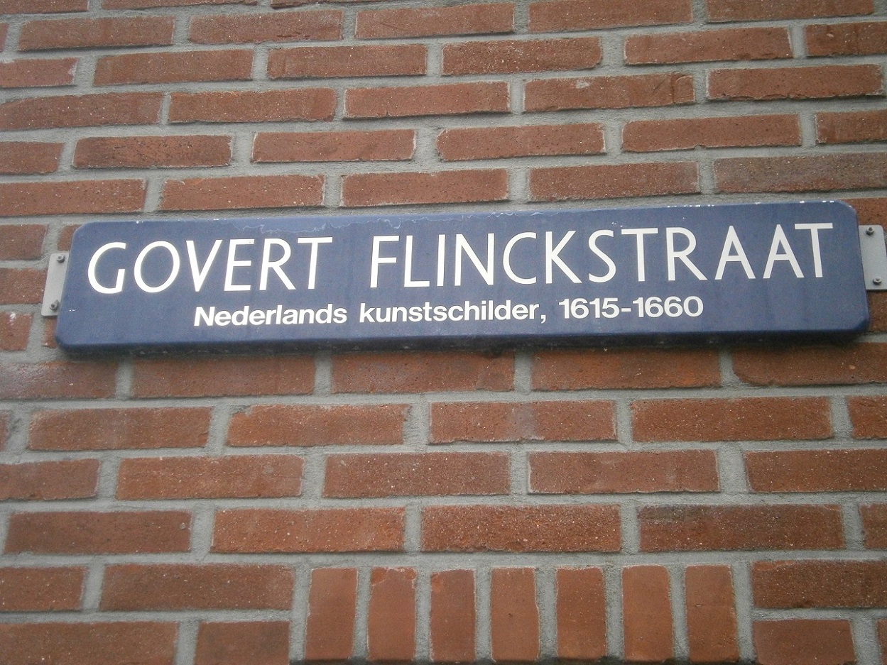 Naar Govert Flinck, geboren 25 januari 1615 te Kleef, overleden 2 februari 1660 te Amsterdam. Was gevierd portretschilder, o.m. aan het hof van de Prins van Oranje (4 april 1955). bron: http://straatnamen.enschede.nl/straten/00282/?char=G