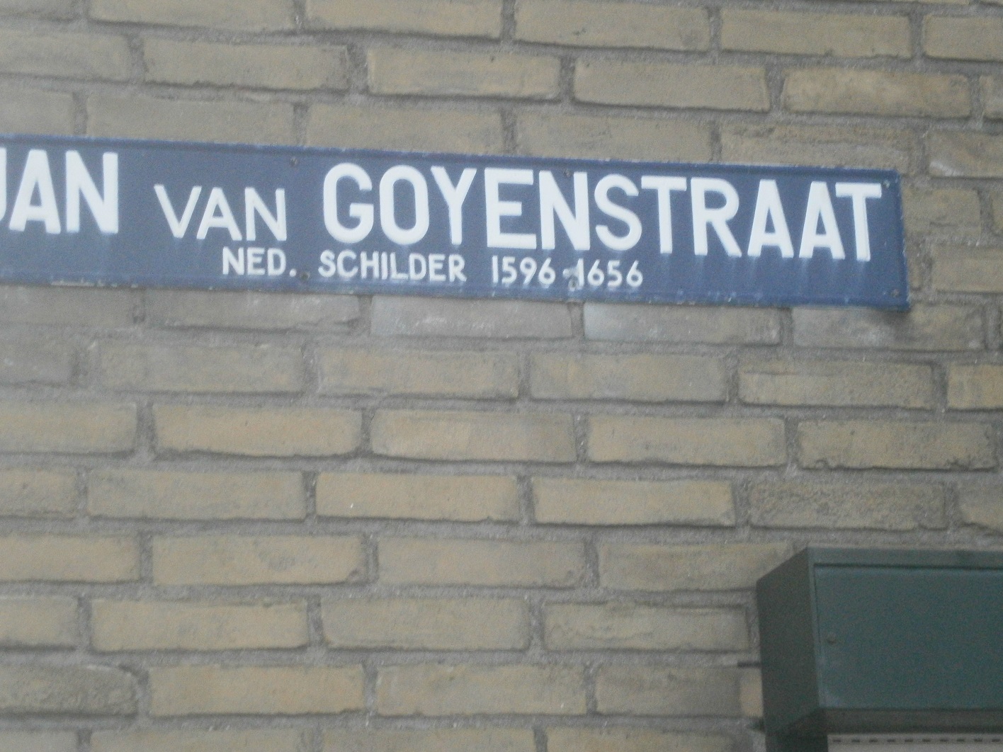 Naar Jan Josephsz van Goyen, Ned. schilder en tekenaar, geboren 13 januari 1596 te Leiden, overleden 27 april 1656 te 's-Gravenhage. Landschapsschilder, wiens voorkeur uitging naar uitgestrekte, laaggelegen weiden met een teer silhouet van een stad aan de horizon; schilderde ook Holl. rivieren en wintergezichten (4 april 1955, gewijzigd 12 november 1956). bron: http://straatnamen.enschede.nl/straten/00355/?char=J