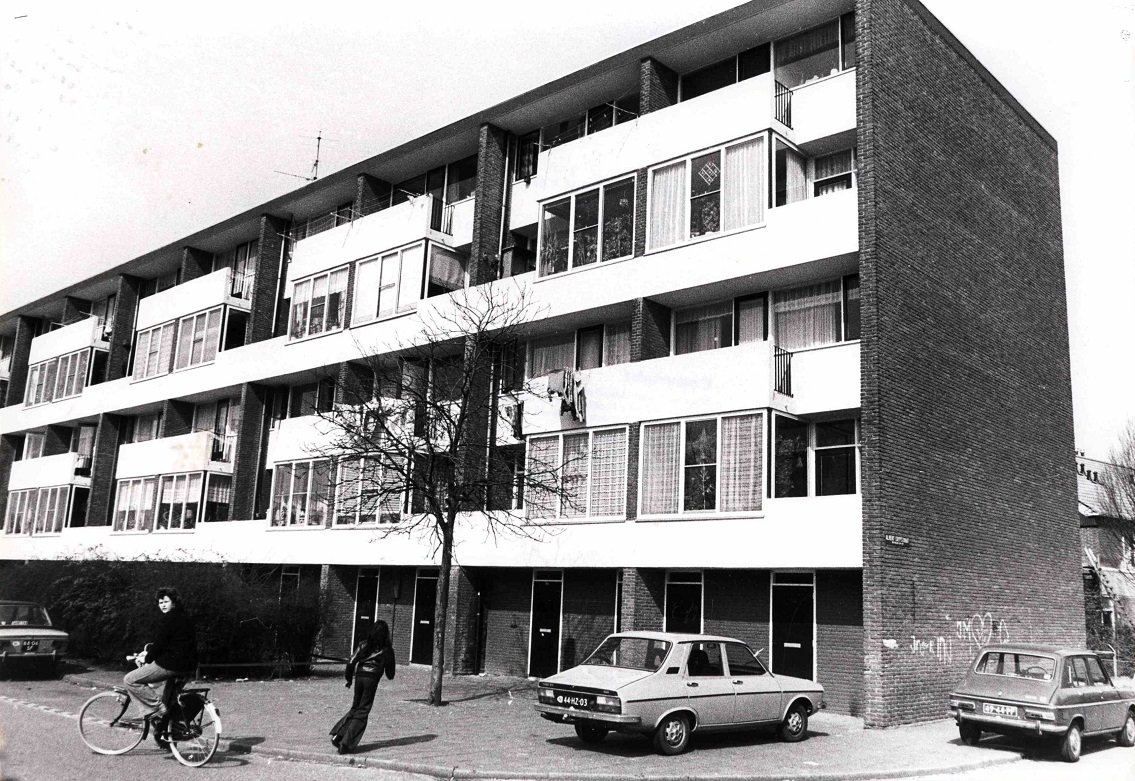 Jan Vermeerstraat april 1978 Zicht op flat, hoek Albert Cuypstraat Stadsveld.jpg