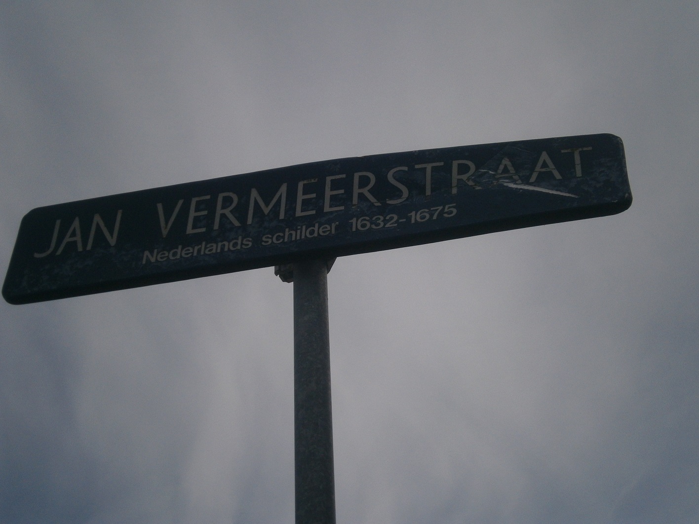 Naar Jan Vermeer, Ned. schilder, geboren 1632 te Delft, overleden 1675 aldaar, Genreschilder, die met sobere techniek en volkomen beheersing, van kleurverdeling, licht- en schaduwwerking etc. van mensen en voorwerpen grote kunstwerken wist te scheppen (4 april 1955, gewijzigd 26 april 1971). bron: http://straatnamen.enschede.nl/straten/01072/?char=J