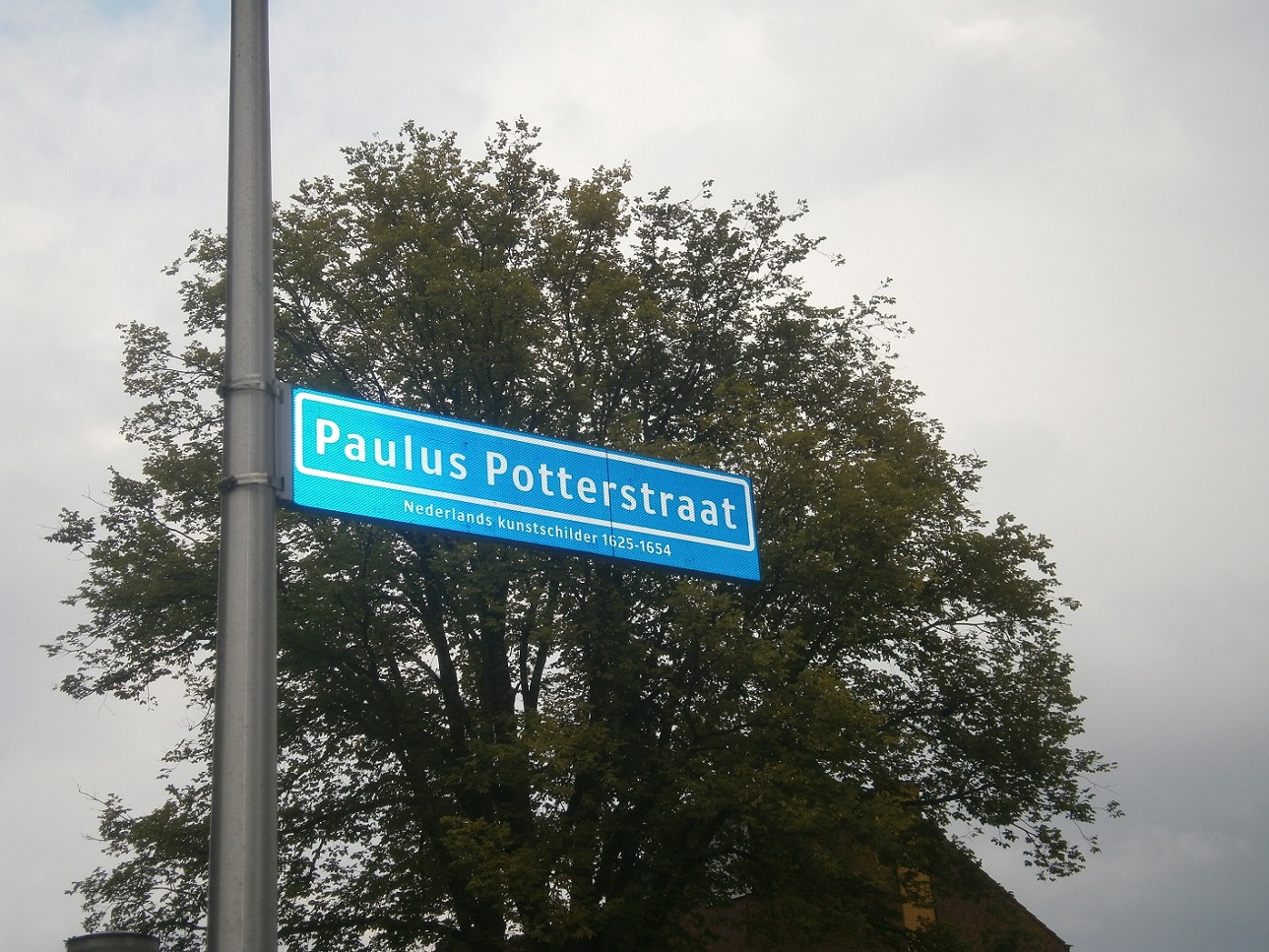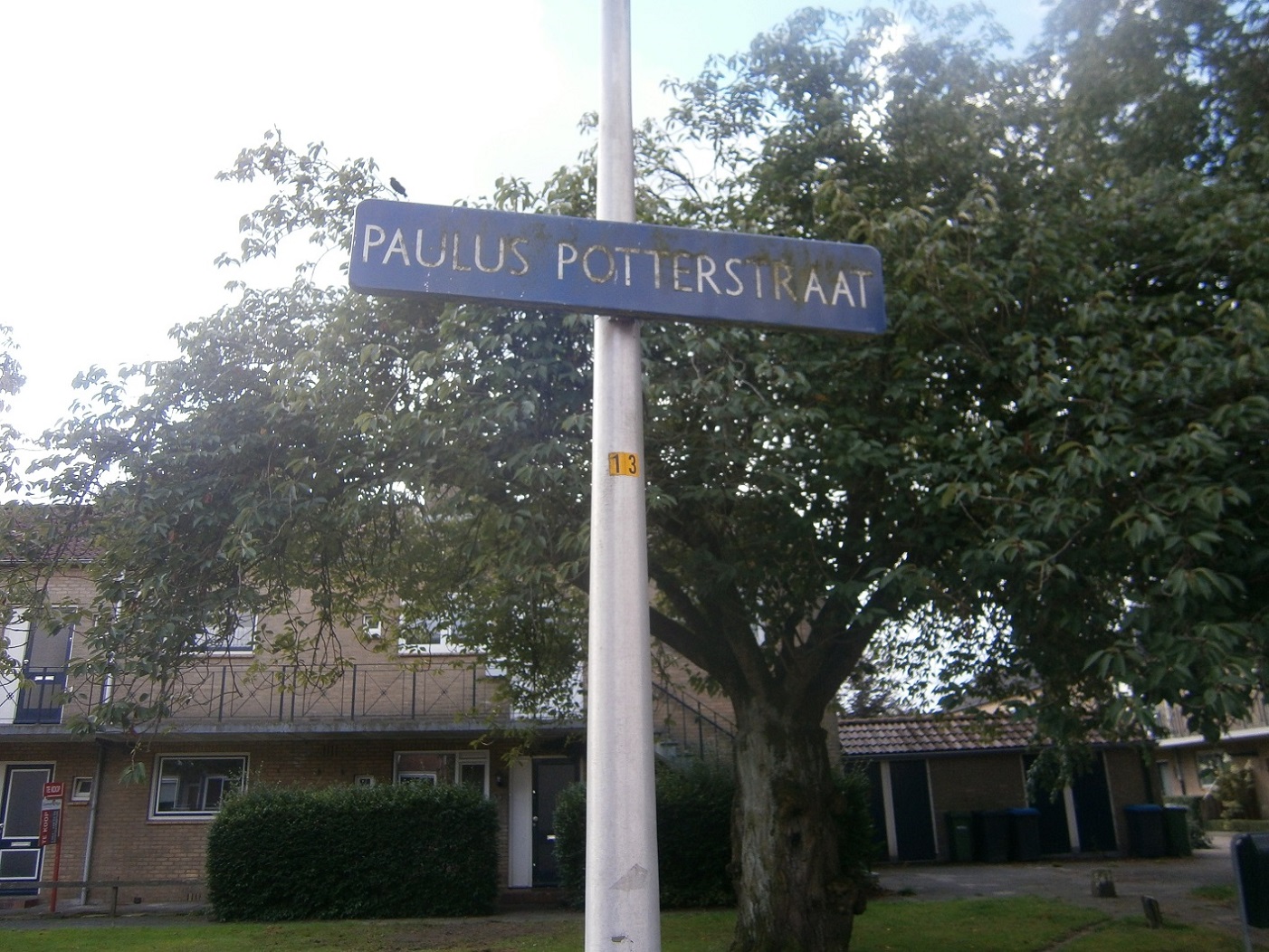 Naar Paulus Potter, Ned. schilder, geboren 1625 te Enkhuizen, overleden 1654 te Amsterdam. Heeft zich als zuiver natuurschilder vooral toegelegd op het schilderen van dieren in hun natuurlijke omgeving en heeft daarmee roem verworven. Bekend is o.m. zijn compositie "De Stier" in het Mauritshuis (12 juli 1954). bron: http://straatnamen.enschede.nl/straten/00787/?char=P
