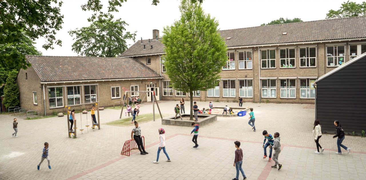 De achterkant van het 100 jaar oude schoolgebouw ziet er strak uit, maar met oog voor de historische details. © De Weerde