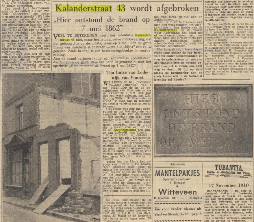 Klalanderstraat 43 sloop pand met gevelsteen op plek Hier ontstond de brand van 1862 krantenbericht Tubantia 17-11-1960.jpg