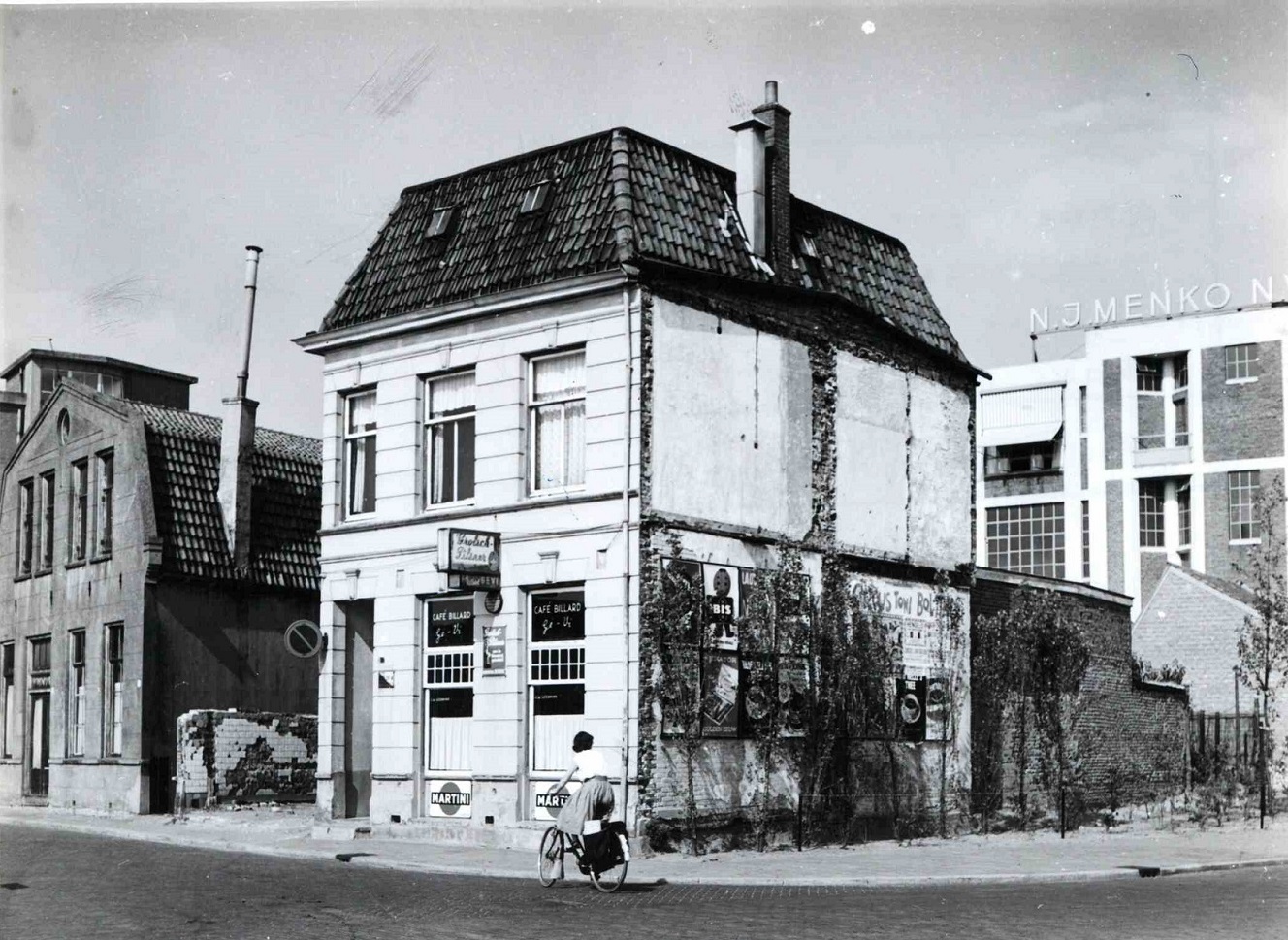Kalanderstraat 59 hoek Beukinkstraat met café GeVi. Op de achtergrond textielfabriek N.J. Menko. 1960.jpg