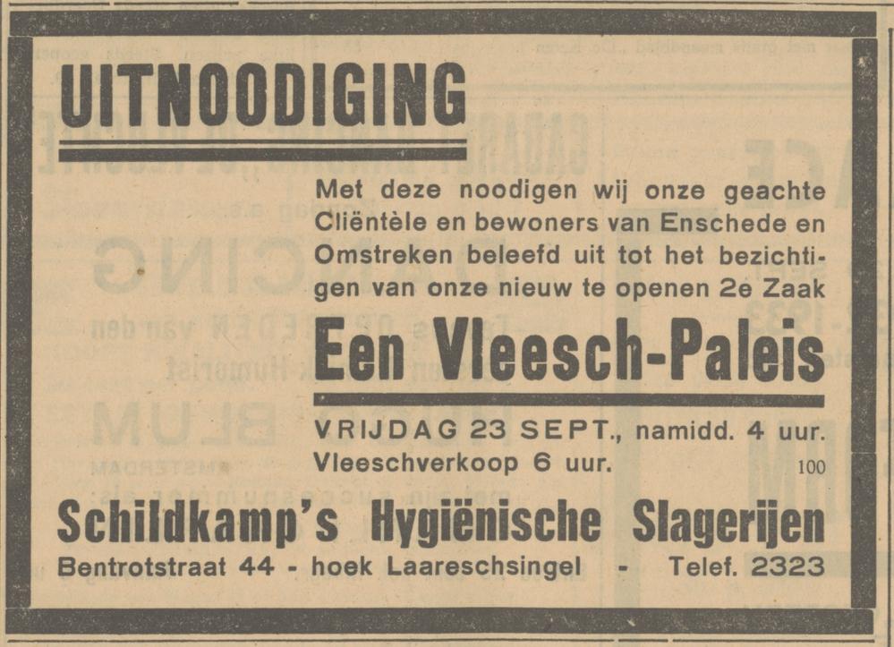 Bentrotstraat 44 Schildkamp,s Hygiënische Slagerijen advertentie Tubantia 22-9-1932