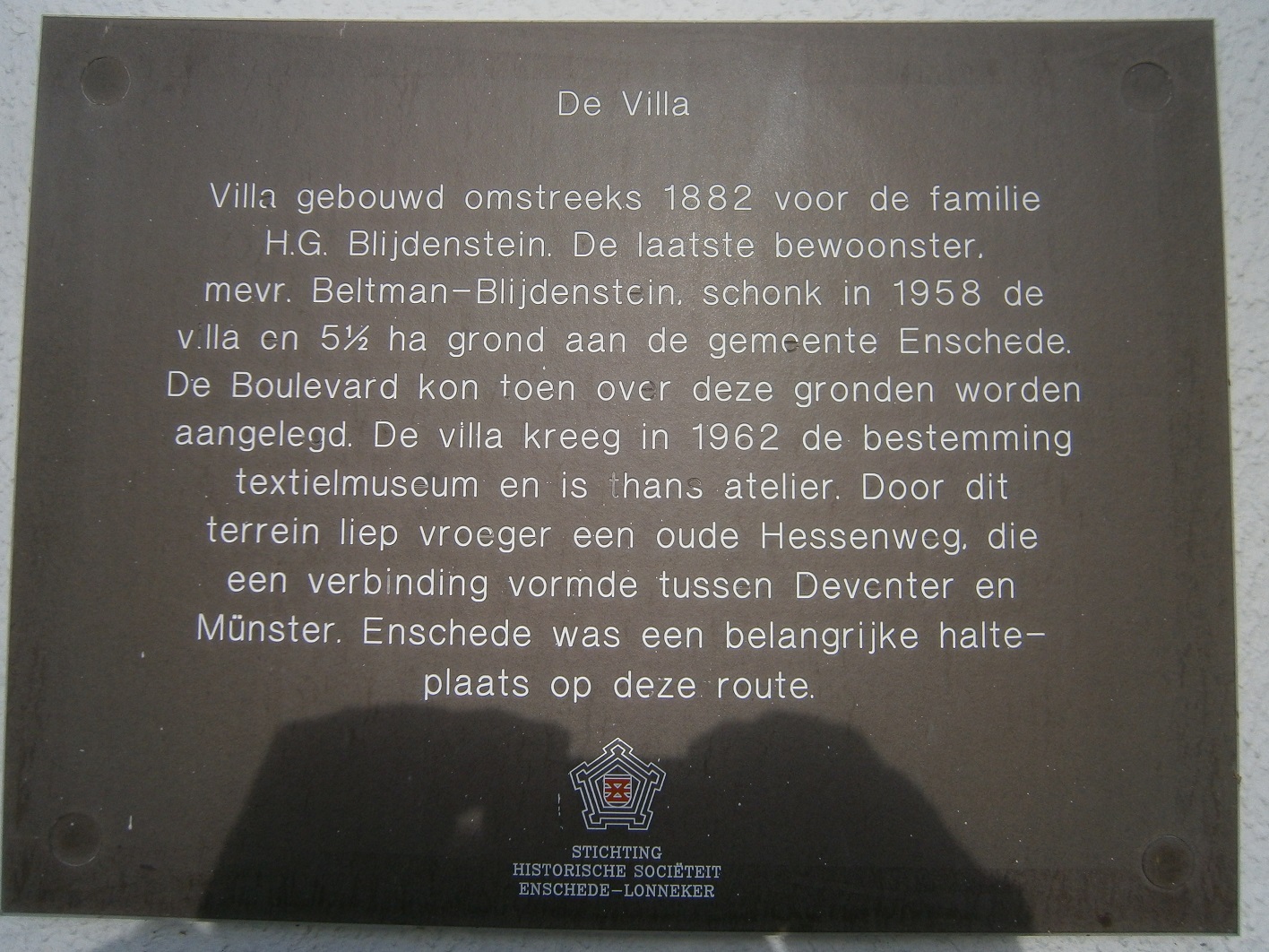Monumentenbord nr. 47 van de lijst. Villa Blijdenstein, ook wel villa De Bank genoemd, aan de Espoortstraat 182. Dus in het Blijdensteinpark aan de Boulevard 1945. Vroeger lag hier de oude Hessenweg. Ook de toenmalige Helweg wordt hierbij genoemd.