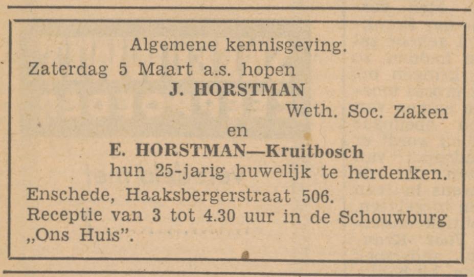 Horstman, J. Weth.v. Sociale- en Person.szaken, Haaksbergerstraat 506.