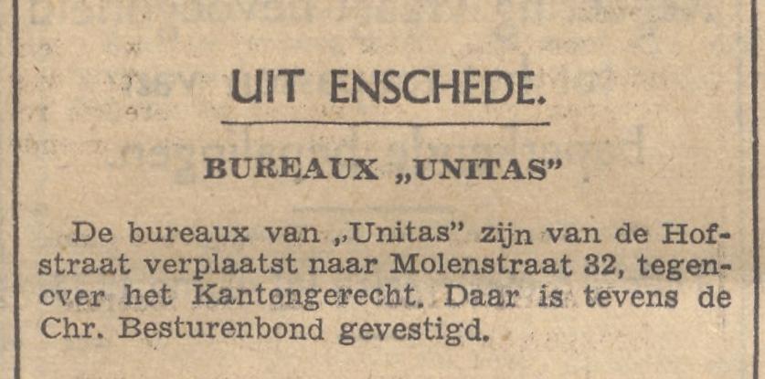 Molenstraat 32 Unitas Chr. Bond van Wernemers in Textiel- en Kledingbedrijven krantenbericht Tubantia 5-12-1957.jpg