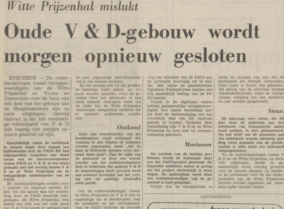 Het oude V&D pand op de hoek Hengelosestraat 1 en Brammelerstraat heeft na vertrek warenhuis Vroom en Dreesmann nog meerdere bestemmingen gehad, o.m. warenhuis Faco en Witte Prijzenhal, zie krantenberichten 18-7-1973 en 30-9-1974