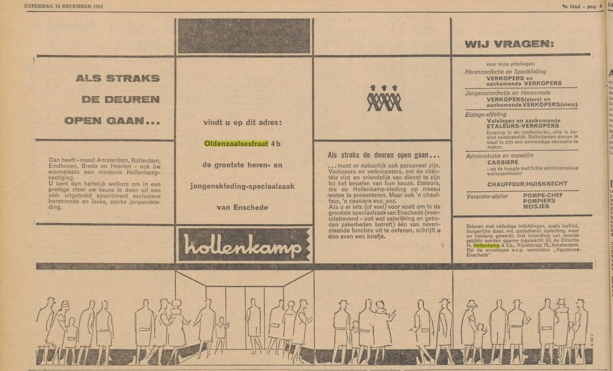 Oldenzaalsestraat 40 heren- en jongenskleding-speciaalzaak Hollenkamp advertentie Tubantia 16-12-1961 en krantenbericht 13-4-1962.