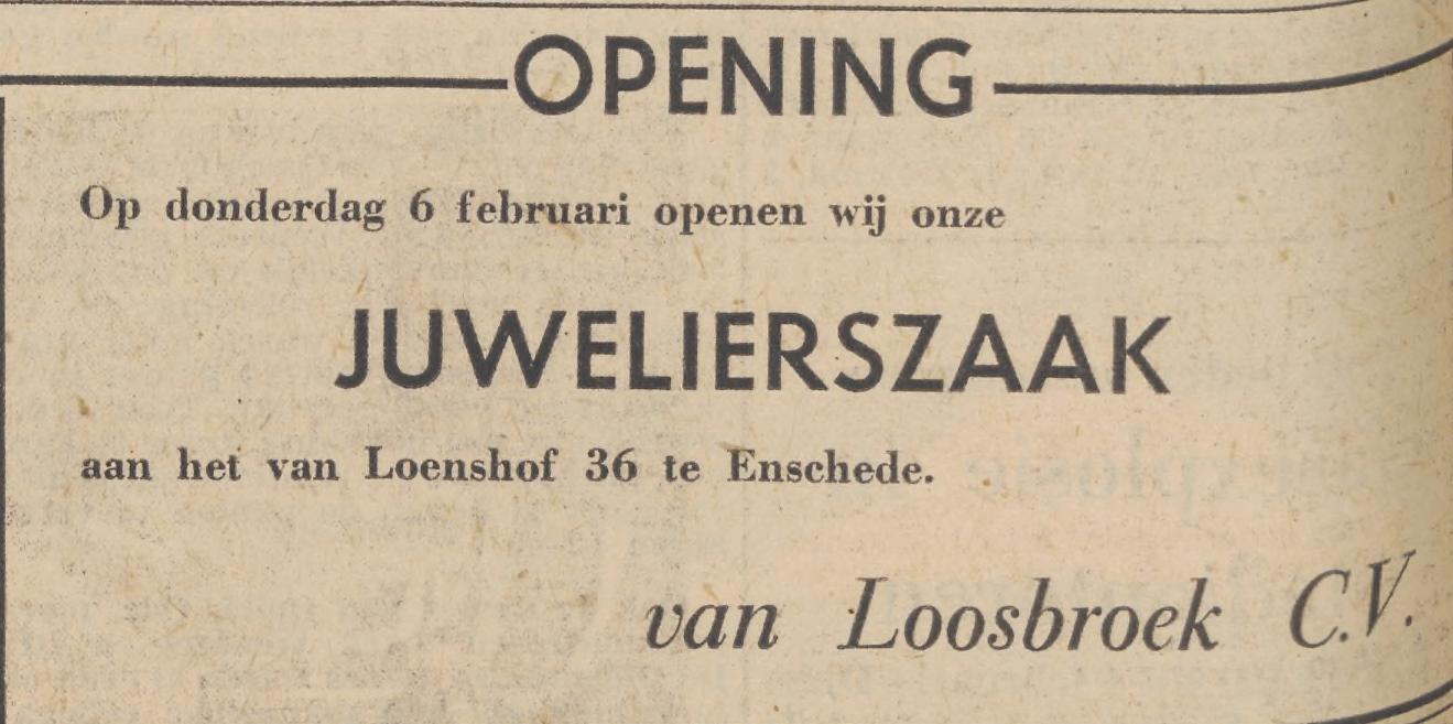 Van Loenshof 36 juwelieszaak Van Loosbroek advertentie Tubantia 5-2-1958 en krantenbericht 7-2-1958.