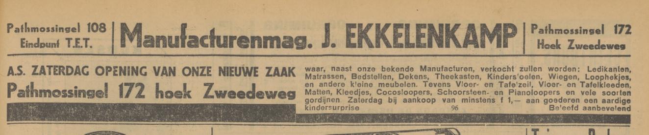 Pathmossingel 172 hoek Zwedeweg manufacturenmagazijn J. Ekkelenkamp advertentie Tubantia 25-4-1929.