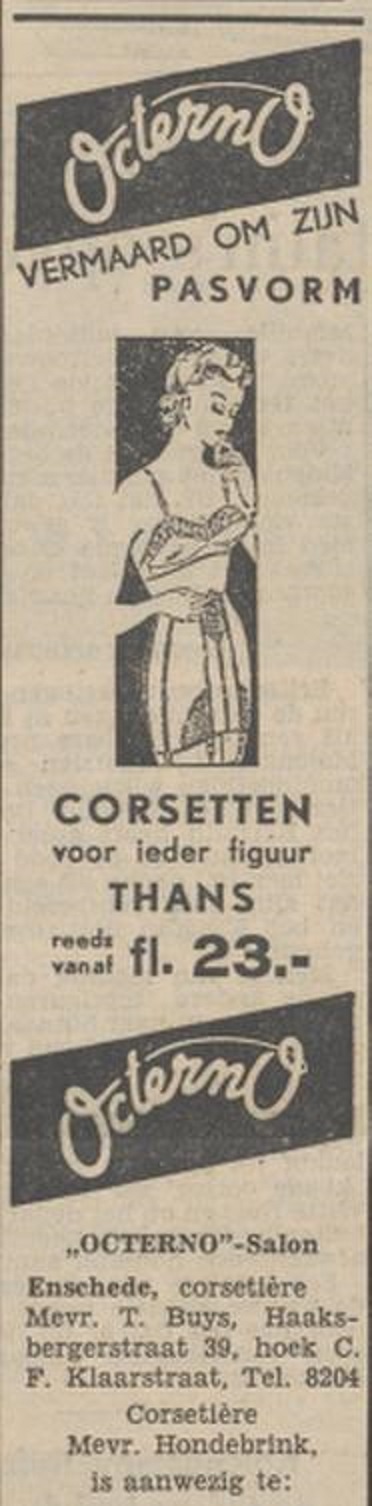 Haaksbergerstraat 39 hoek C.F. Klaarstraat Octerno corsetiere Mevr. T. Buys advertentie Tubantia 9-3-1953