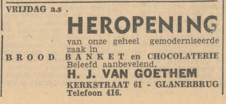Kerkstraat 61 Glanerbrug cafetaria van Goethem in de jaren '50. Daarvoor in 1947 was het een winkel van H.J. van Goethem in brood, banket en chocolaterie.
