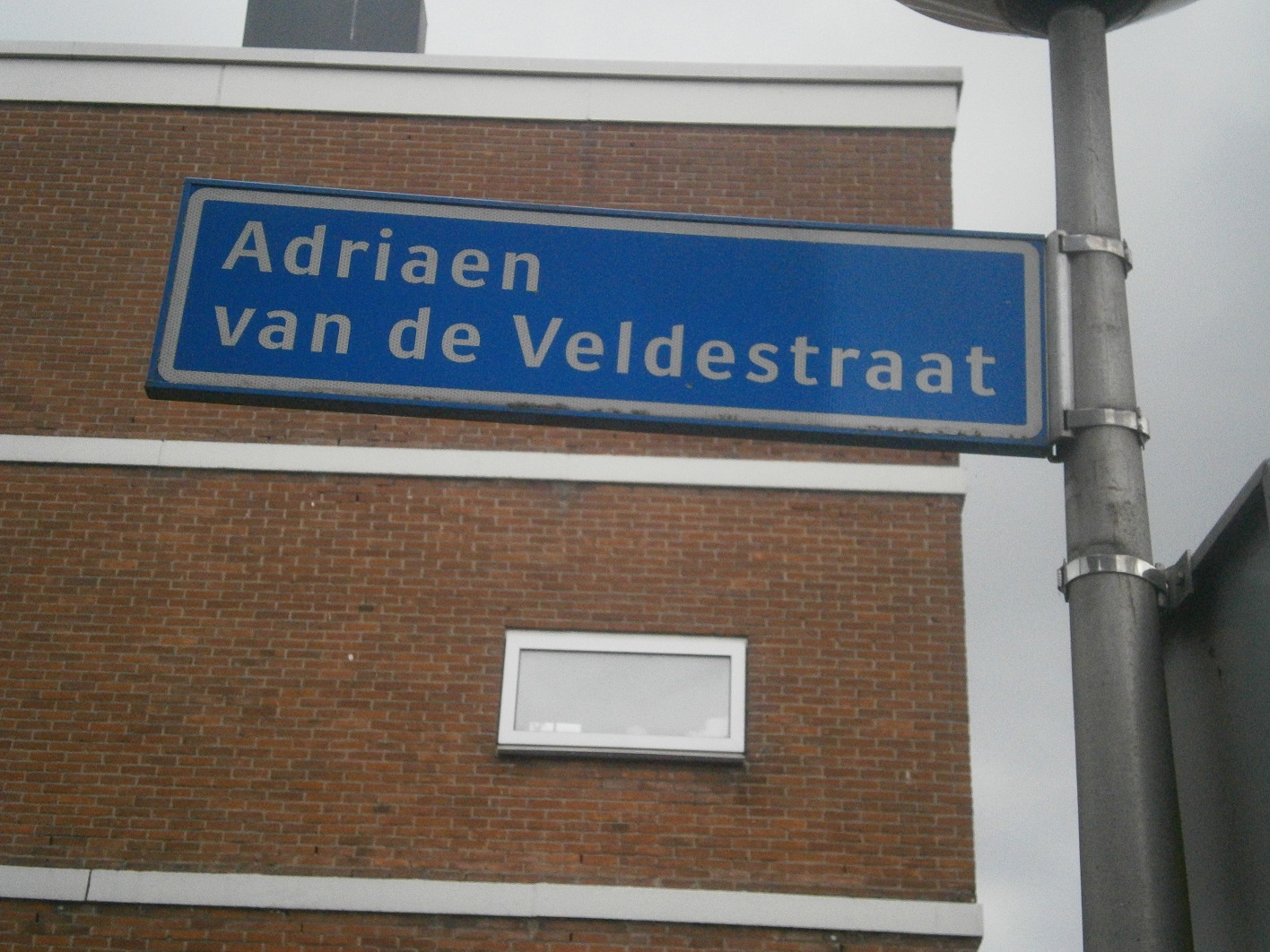 Naar Adriaen van de Velde, Ned. schilder en prentkunstenaar, geboren 1636 te Amsterdam, overleden 1672 aldaar. Geniet reputatie één van de beste Hollandse schilders van landschappen, bosrijke streken etc. te zijn, waarin dieren (vooral koeien) voorkomen (12 november 1956). bron: http://straatnamen.enschede.nl/straten/01060/?char=A
