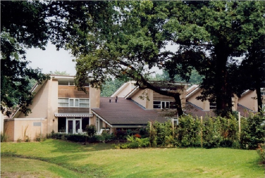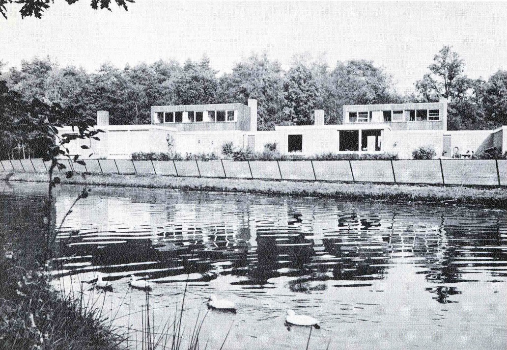 Langenkampweg 1968 Campus Technische Hogeschool Twente ( T.H.T. ). Zicht op woningen van de hoogleraren, met vijver op voorgrond.jpg