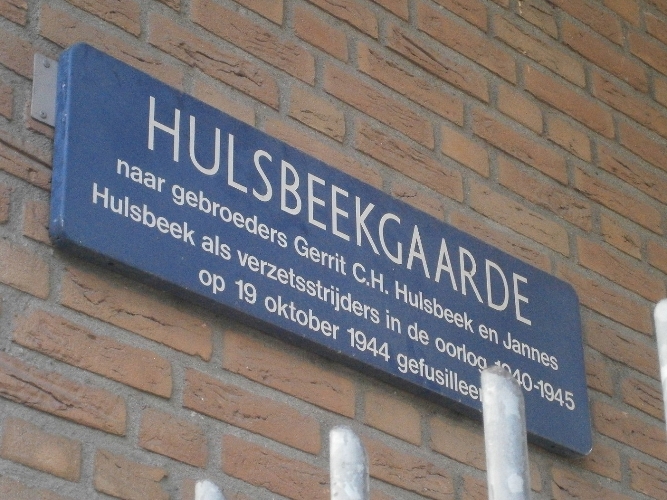 Naar de gebroeders Gerrit G.H. Hulsbeek en Jannes Hulsbeek, als verzetstrijders in de oorlog 1940-1945 op 19 oktober 1944 gefusilleerd (2 juli 1985). bron: http://straatnamen.enschede.nl/straten/01455/?char=H