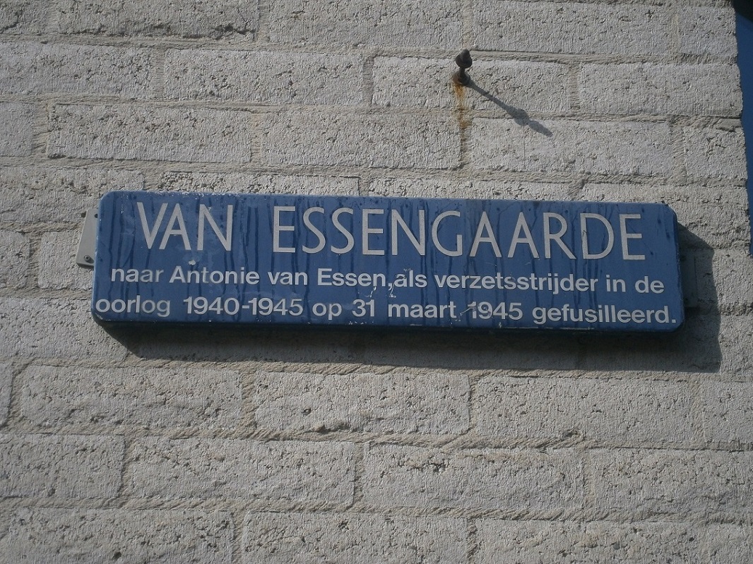Naar Anthonie van Essen, als verzetsstrijder in de oorlog 1940-1945 op 31 maart 1945 gefusilleerd (2 juli 1985). bron: http://straatnamen.enschede.nl/straten/01457/?char=V
