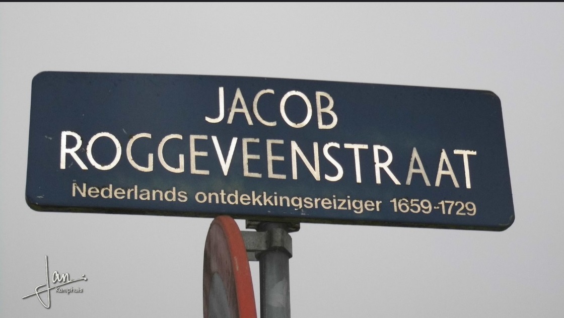 Naar Jacob Roggeveen, Ned. jurist en ontdekkingsreiziger, geboren 1 februari 1659 te Middelburg, overleden 1729 aldaar. Ondekte tijdens een exploiratiereis met 3 schepen van de West Indische Compagnie het Paaseiland (4 april 1955). bron: https://straatnamen.enschede.nl/straten/00841/?char=J
