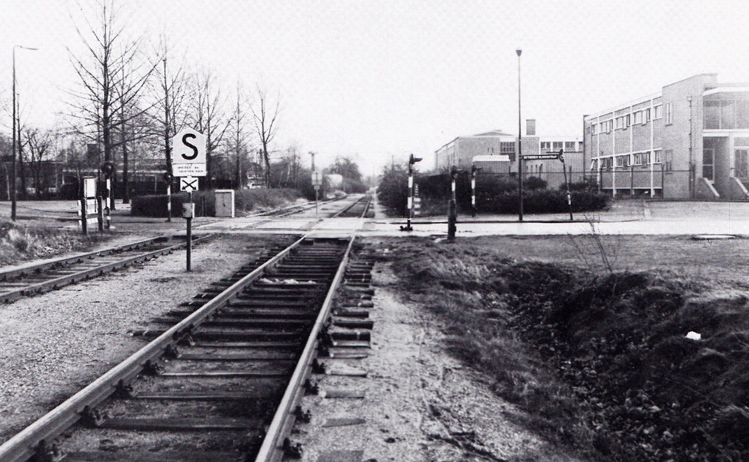 Wethouder Nijhuisstraat 1959 De kruising met het spoor naar Boekelo. Rechts gebouwen van de Gemeentelijke Reinigingsdienst..jpg
