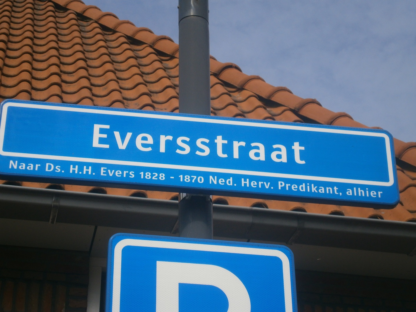 Naar Harmen Hendrik Evers, geboren 31 oktober 1792 te Rheinberg (Pr.) overleden 21 november 1870 te Enschede, Ned. Herv. predikant alhier van 1828 tot aan zijn dood. Mede op zijn initiatief kwam het tot het stichten van de Fabrieksschool; met Deken van Coeverden en S. Bloemendaal maakt hij voorts deel uit van de hoofdcommissie tot leniging van de nood, ontstaan door de brand van 1862 (22 november 1926 voormalig Enschede). bron: http://straatnamen.enschede.nl/straten/00275/?char=E