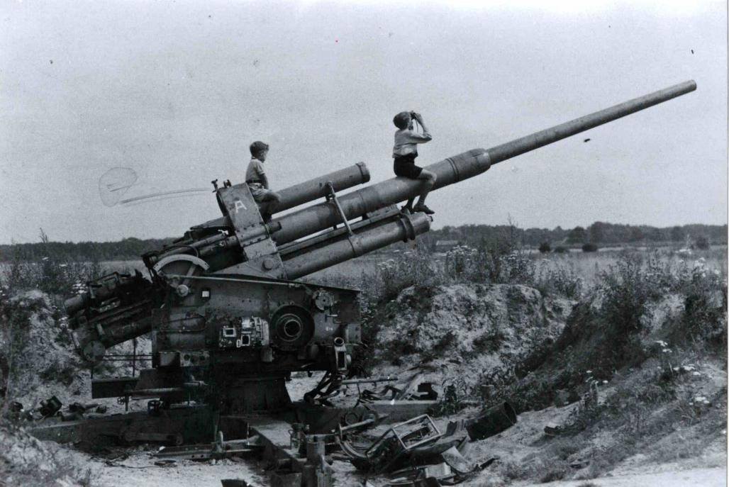 Burg. Stroinkstraat Bruggenmorsweg 1945 achtergelaten luchtafweergeschut.jpg