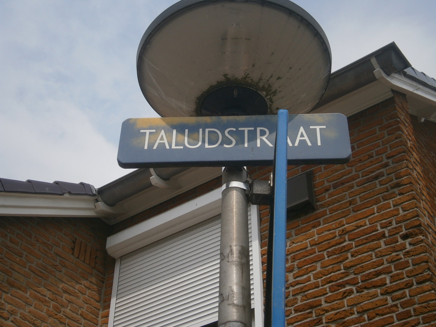 Ontleend aan het talud van de oprit van Wethouder H.C. Nijkampbrug over het voormalig emplacement zuid waarlangs deze straat loopt (7 december 1931) voormalig Enschede, gewijzigd 8 februari 1960). bron: http://straatnamen.enschede.nl/straten/00988/?char=T