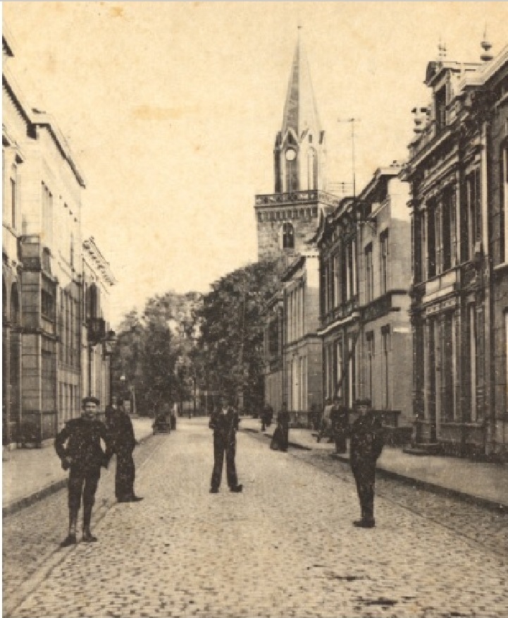 En zo zagen de panden Langestraat 40-62 er in 1900 uit. De Grote Kerk op de Oude Markt nog met oude toren.