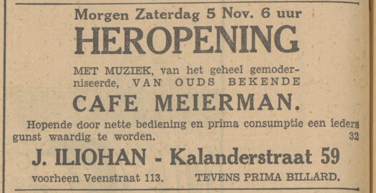 Na uittreden van J. Iliohan werd H.H. Steenberg op 14-2-1936 eigenaar van het cafe restaurant Het Centrum aan de Kalanderstraat.