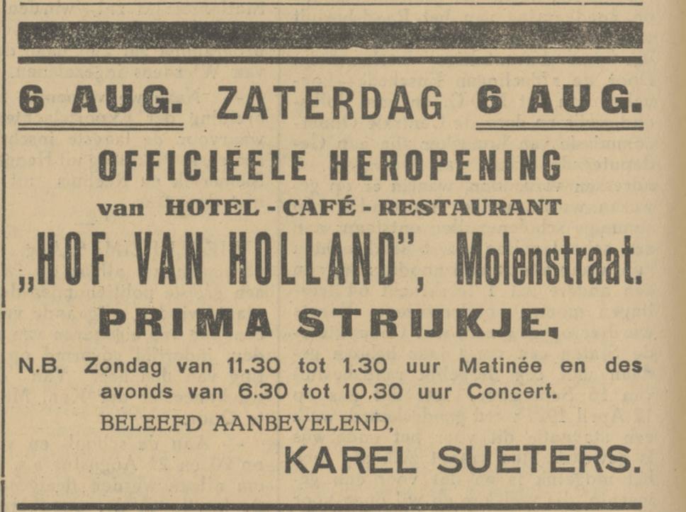 Molenstraat 69 Hotel cafe restaurant Hof van Holland Karel Sueters.