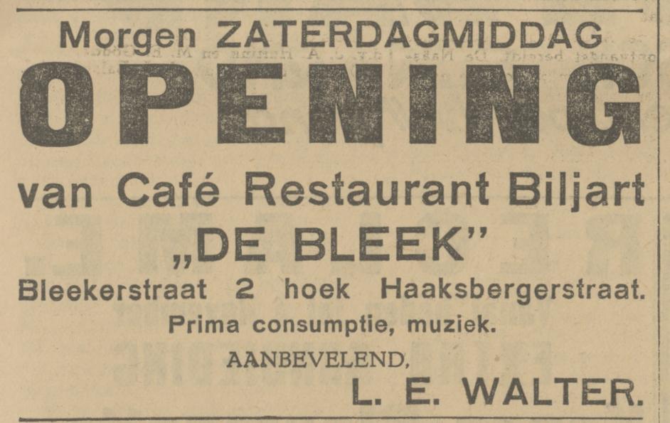 In het pand Blekerstraat 2 hoek Haaksbergerstraat werd in 1927 het cafe restaurant biljart De Bleek geopend door L.E. Walter.