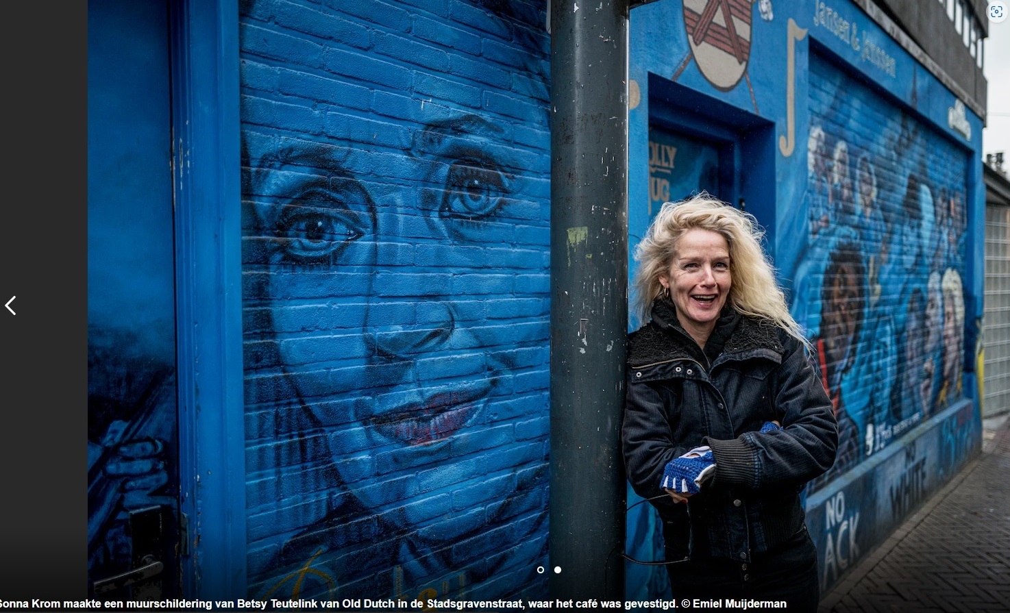 Het pand van Old Dutch is later gekocht door horecaman Fons Moeskops. Hij gebruikte het voor uitbreiding van zijn café Paddy’s. Zie het als een eerbetoon aan Betsy Teutelink, zegt Timmer en hij is niet de enige die mooie herinneringen koestert. Ook Sonna Krom doet dat; ze maakte in de Stadsgravenstraat een muurschildering van kroegbazin Betsy. „Ze verdiende het”, zegt Krom. Sonna Krom maakte een muurschildering van Betsy Teutelink van Old Dutch in de Stadsgravenstraat, waar het café was gevestigd.